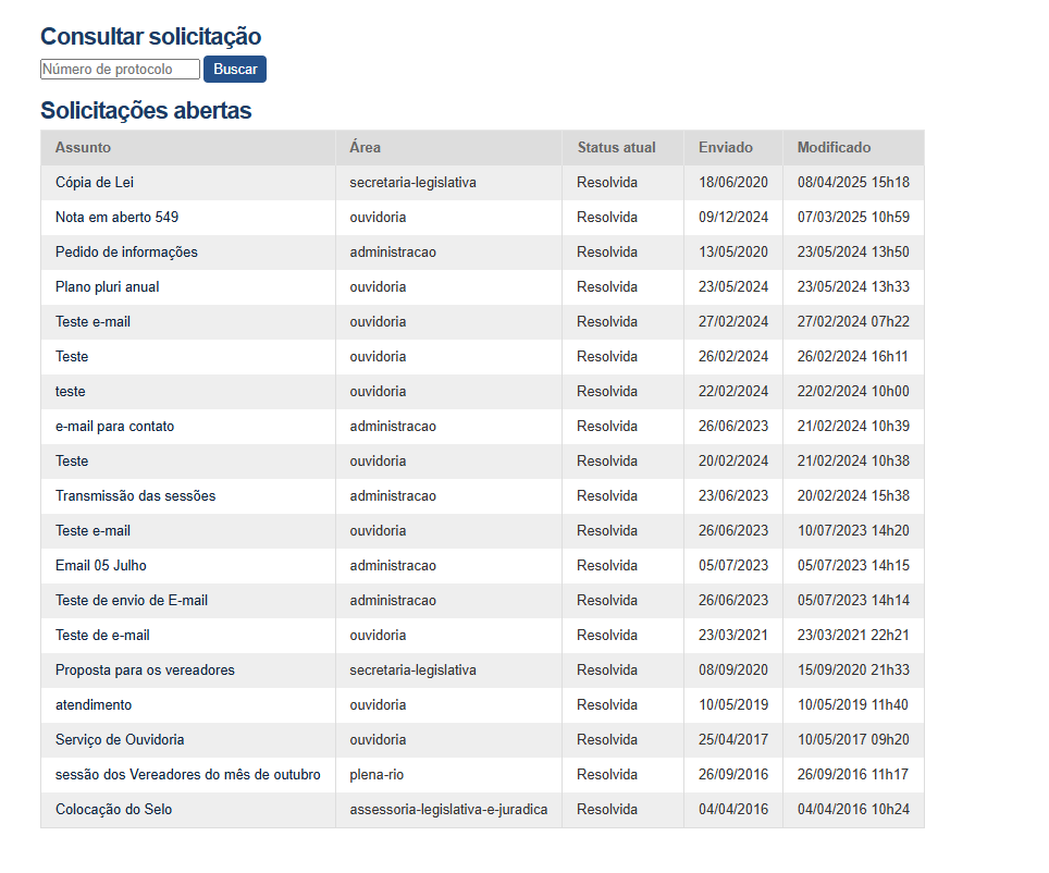 Lista das solicitações Ouvidoria até 2025